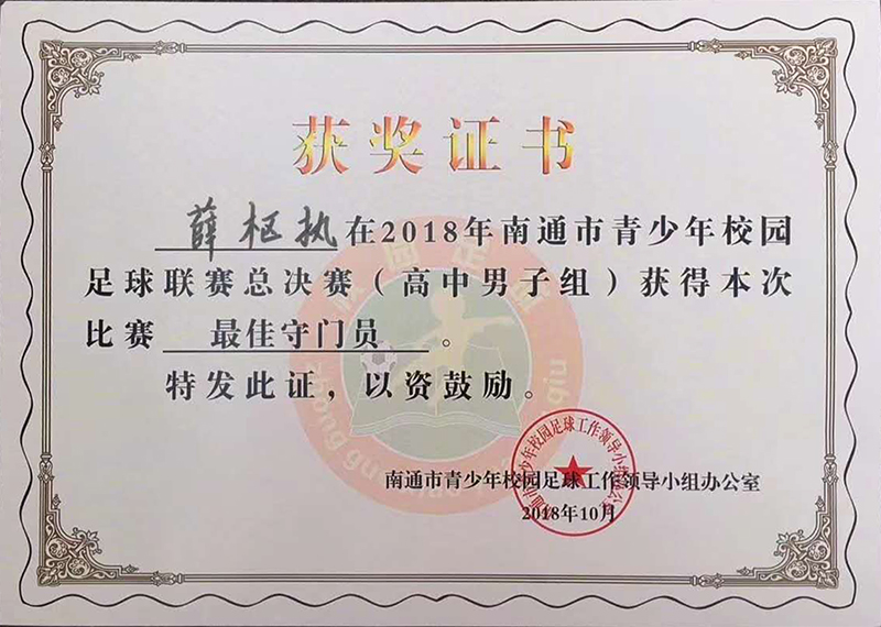10月4至7日,2018年南通市青少年校园足球联赛(高中组)总决赛在海安市城南实验学校举行,全市14支代表队参加了比赛。海安中学积极组队参赛。海中16名队员团结协作,顽强拼搏,在小组赛首场失利的情况下,愈战愈勇,在进入下一轮的比赛中,一球未失连下三城。最终获得比赛第五名(二等奖第一名)。章泽同学获得本次比赛男子组“最佳阵容”奖;薛枢执同学获得本次比赛“最佳守门员”。比赛期间,海安中学队员因严于律己,尊重对手,服从裁判,赢得了大会组委会和参赛各队的充分肯定。