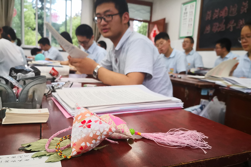 许尧老师还和大家一起阅读了其他描写如春节、上巳、清明、冬至等传统节日的古典诗词。课后,她悄悄在每个学生桌边挂了一只五彩丝线艾叶香包。艾草味氤氲开来,连夏季的暑热也仿佛在这草本的芬芳中一点点消除。这寄寓着老师对学生的无限祝福,也希望这是一次难忘的备考过程中的端午。
