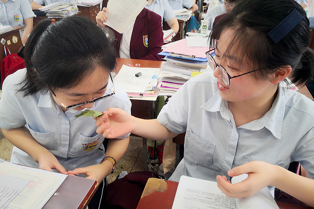 大家还一起阅读梅尧臣的“沅湘碧潭水,应自照千峰”,褚朝阳的“越人传楚俗,截竹竞萦丝”,陆游的“粽包分两髻,艾束著危冠”……在这些与端午节相关的古典诗歌中,回顾、简述了端午节挂艾叶、悬菖蒲、佩香囊、缠五彩丝绳这些习俗的由来和意义。同学们笑说端午节不仅仅有粽子和假期,它还有诗词中的香草,文人心中的坚守。