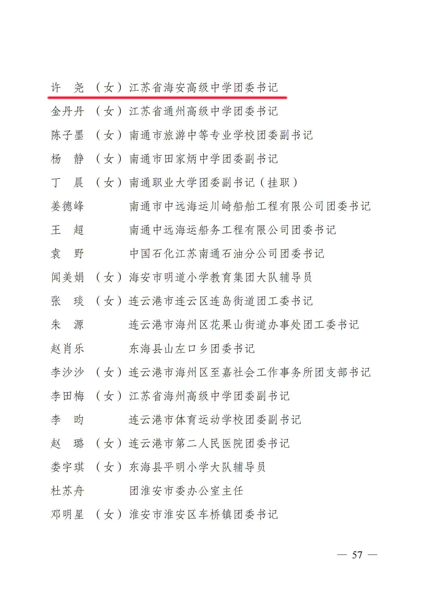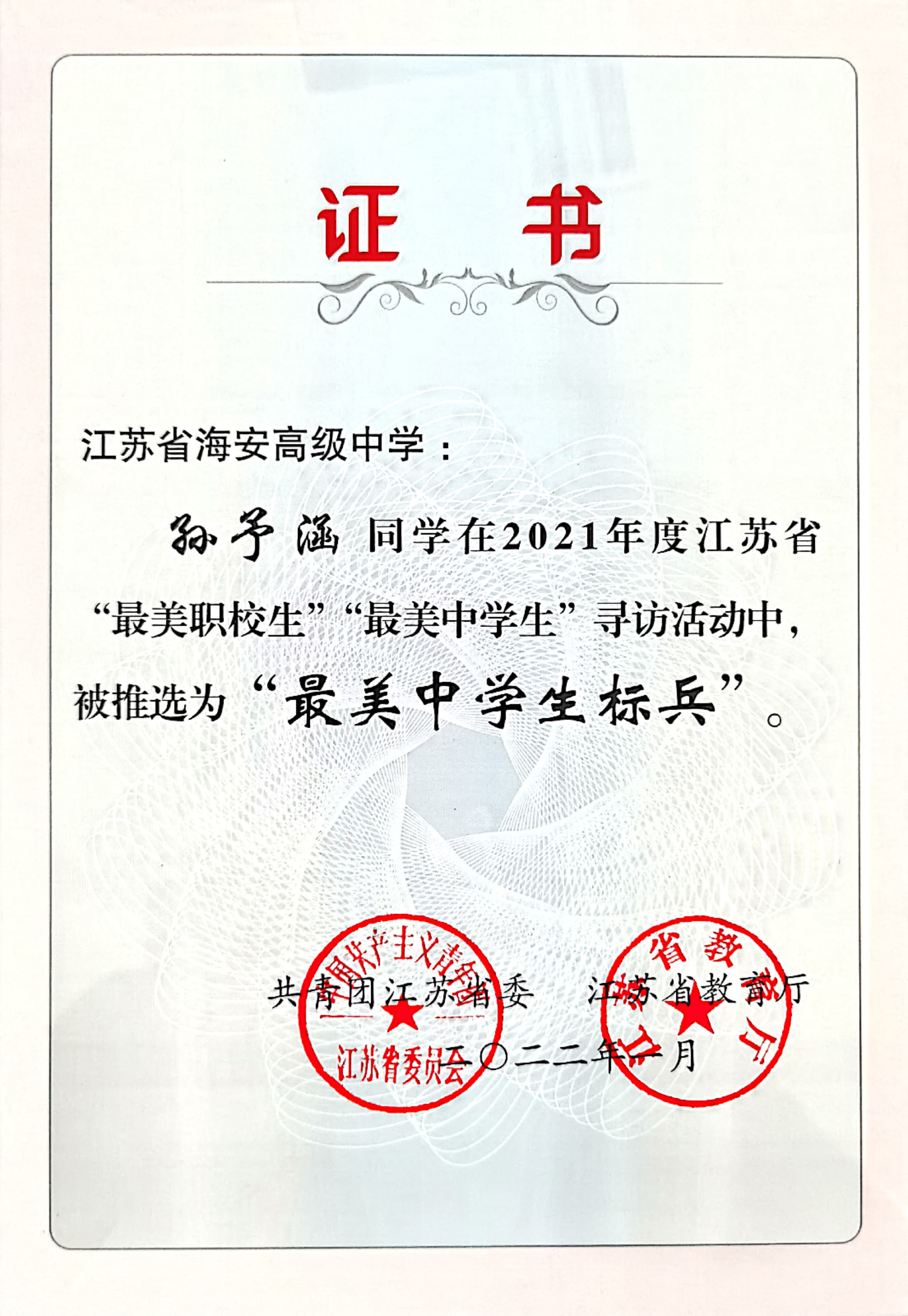 共青团江苏省委、江苏省教育厅公布2021年全省寻访“最美中学生”“最美中职生”活动结果。江苏省海安高级中学孙予涵同学获江苏省“最美中学生标兵”称号,顾盾寒同学、张开心同学获江苏省“最美中学生”称号,史天行同学、刘鸿瑞同学获南通市“最美中学生”称号。