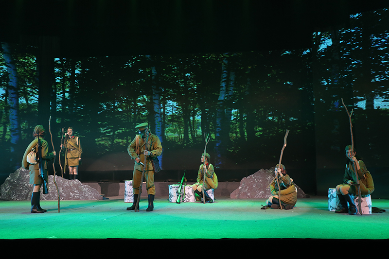话剧《这里的黎明静悄悄》根据前苏联同名小说改编,讲述了卫国战争时期,5位对爱情、对生活有着美好憧憬的花季女兵,在准尉的带领下英勇抗击德寇,最终牺牲在白桦林中的故事,引发人们对侵略战争的思考和对人性的多元理解。故事情节跌宕起伏,扣人心弦。来自高一年级18个班级的52位学生演员联袂出演,三幕联排同台呈现,用极具张力的表演,塑造了一个又一个鲜活生动的人物形象,深深地感染了每一位到场的观众。