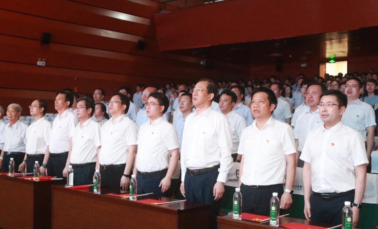 党委书记、校长吕建和“光荣在党50年”奖章获得者代表带领新党员宣誓
