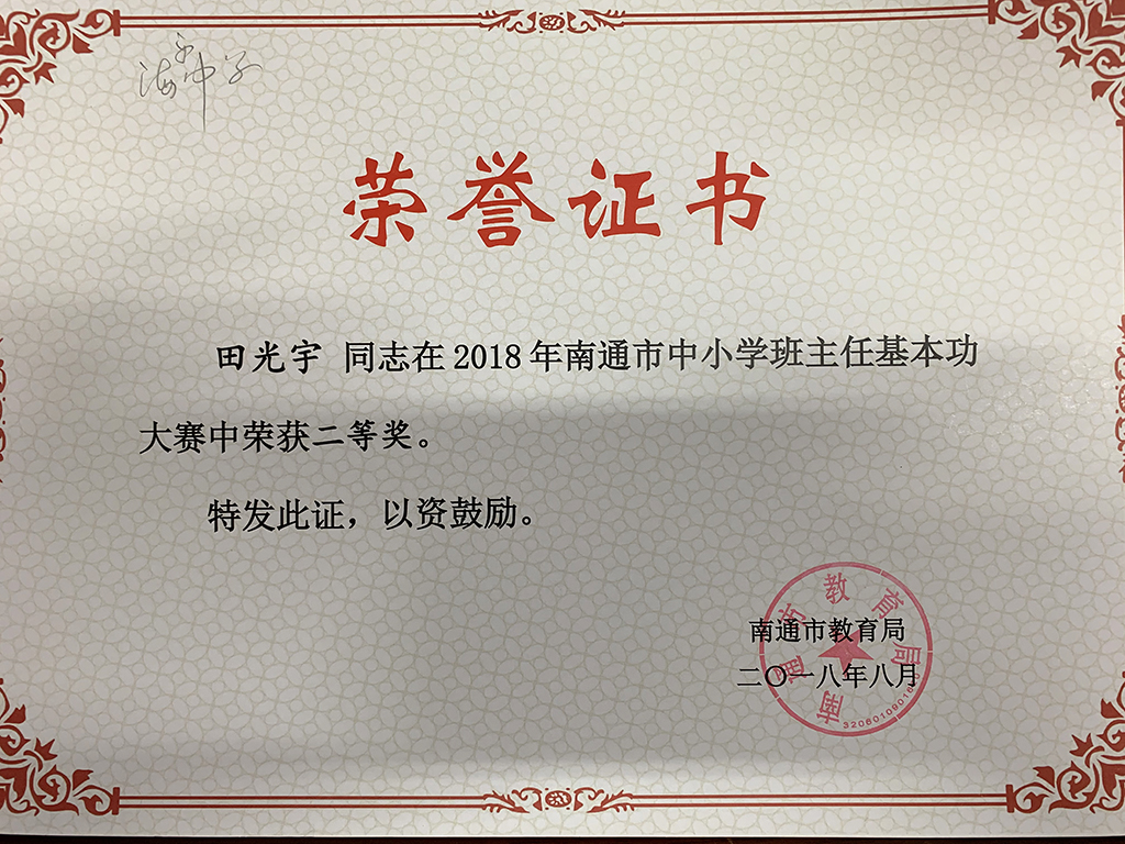 田光宇老师在2018年南通市班主任基本功中获二等奖