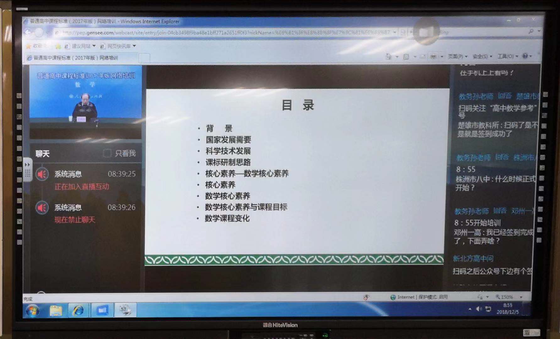 为深化理解教育部印发的《普通高中课程方案和语文等学科课程标准(2017年版)》,并为即将到来的新课程改革做好思想准备,提高对新课改的理论认识。根据省海中教研室的周密安排, 12月5日上午8:45—12:00,我校数学组全体老师集中在录播教室参加了普通高中数学课程标准网络培训。