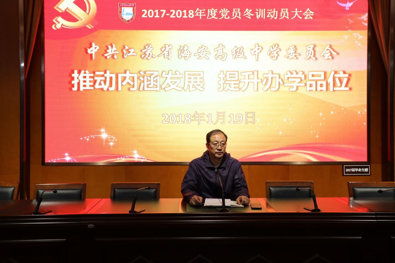 2018年1月19日下午,江苏省海安高级中学召开党员冬训动员大会。学校党委书记吕建做了动员报告。他强调一要充分认识冬训的重要意义,要把冬训与师德师风建设与党性教育联系起来。二要充分认识学习重点,要把冬训和学习十九大精神和省市县相关工作部署结合起来。三要注重实效,要把冬训与即将开展的“一校一品”党建文化品牌建设、“省文明校园”和“全国文明校园”创建统一起来。吕建书记希望全体党员干部倍加珍惜这次难得的学习机会,端正学习态度,严明学习纪律,务实参训,确保学有所获。要把冬训工作作为加强理论武装、建设学习型、服务型、创新型党组织的重要内容,与文明实践相结合,抓紧抓实、抓出实效。