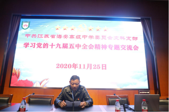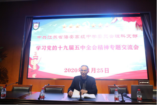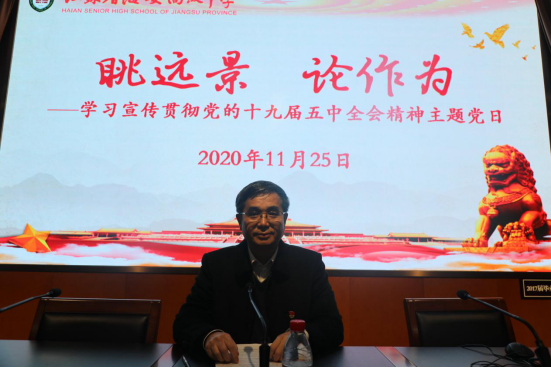 2020年11月25日下午,江苏省海安高级中学党委在奥林匹克楼一楼第一会议举行了以“ 眺远景论作为”为主题的“学习宣传贯彻党的十九届五中全会精神主题党日”活动。活动由学校党委委员、副校长杨斌主持,全体党员参加了活动。