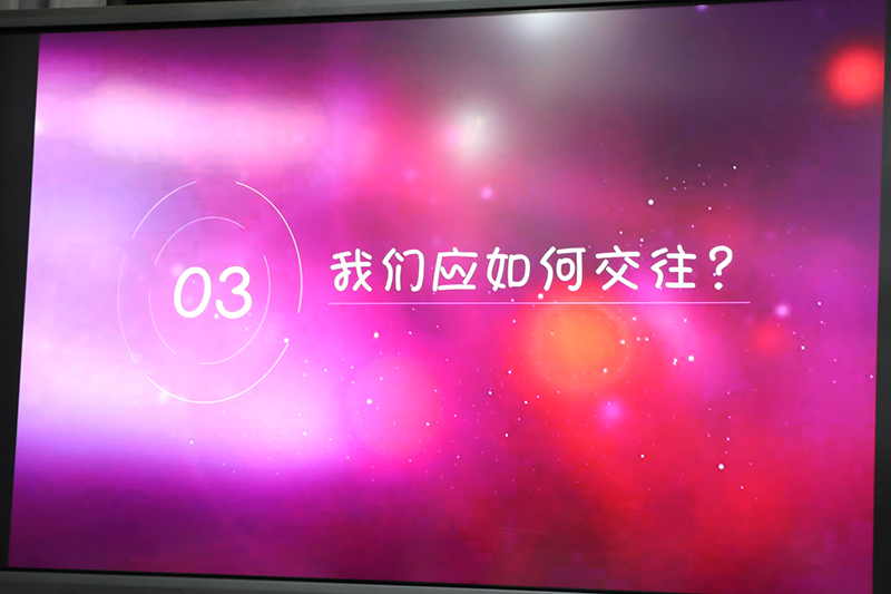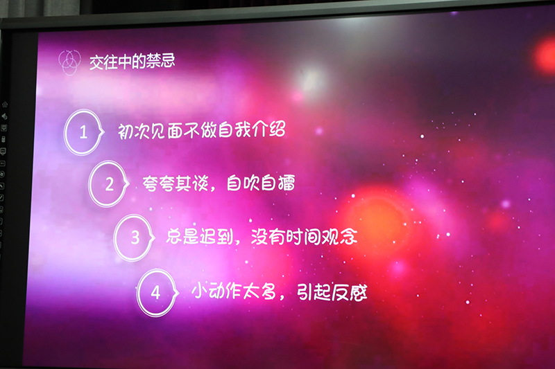 在激烈的讨论之后,班会进入最后一个环节“该如何交往”。主持人谈及“三A原则”,并为大家分享了交往秘诀,帮大家避开交往中的禁忌,让同学们在这次班会中收获满满。本次班会在同学们的掌声中圆满结束,大家都一致认为,这不是终点,未来还需我们进一步开拓、实践。