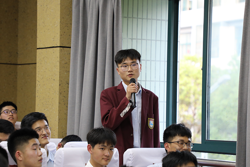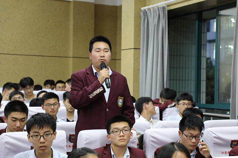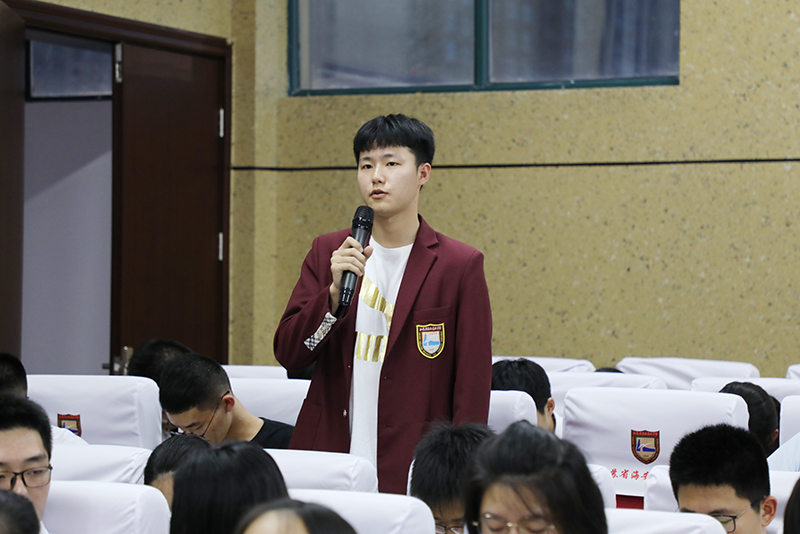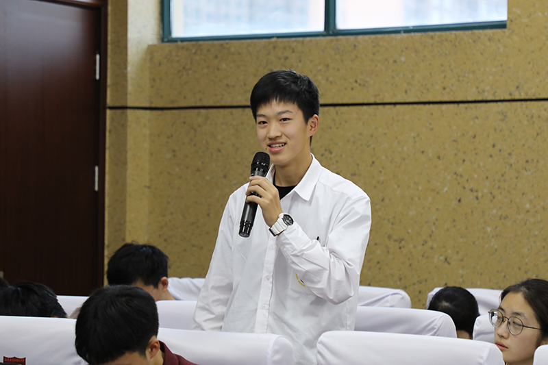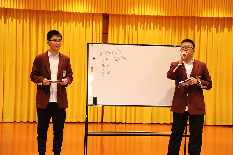 在“我们应该如何交往”环节中,贺煦峰、刘帅廷、崔灿、刘书铭主演的情景剧《宰相之争》掀起了班会的高潮。情景剧幽默风趣,看似和交往毫无关系,实则通过各种线索暗示了人际交往中的竞争,合作与冲突,让人不得不佩服编剧的聪明才智。情景剧之后,同学还发表了自己对交往的理解。其中,丁卫宏同学认为交往宛若阳光空气,必不可少;陆舟、吴张菲、周宇同学认为交往应慎重、平淡、温暖,让人产生幸福感;热心的观众则认为交往应友善。