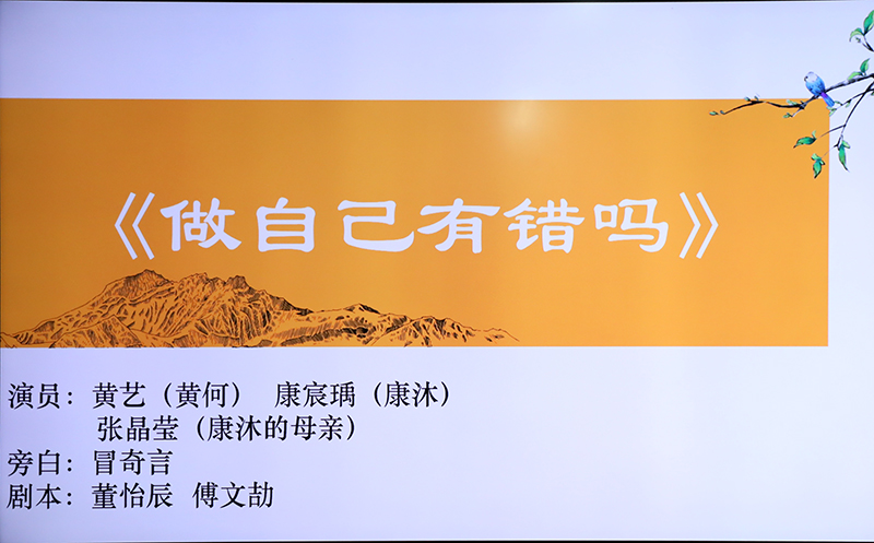 随后,主持人引导大家进入班会课的第二环节:检视自我。一部由傅文劼、董怡辰同学编写,康宸瑀、黄艺、张晶莹、冒奇言同学表演的情景剧《做自己有错吗》将本次活动推向了高潮。此剧讲述了一段小插曲:小康同学在做自己的过程中,忽视了自身性格中存在的缺陷,危害了同桌黄何的利益。此举对他人造成影响,同时自己也十分苦恼。通过此环节,同学们都从角色身上或多或少地找到了自己的影子,感慨颇多。