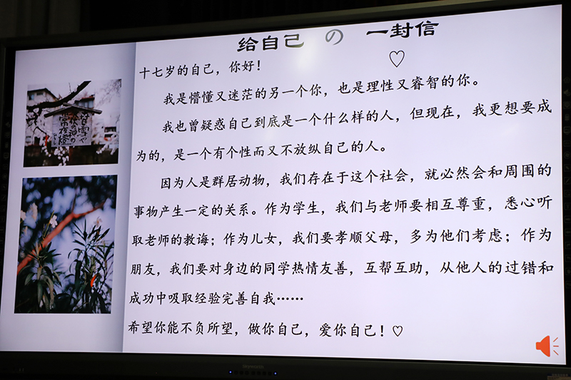 情景剧结束后,班会进入最后一个环节:完善自我。同学们对情景剧中小康接下来的行为展开了大胆猜测,在一番激烈的讨论之后,大家做出了总结:做自己是不错,但要在生命中一步步完善自己,做最好的自己。