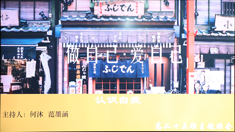 班会以一段振奋人心的入场视频拉开了序幕,此开场紧紧抓住了大家的心弦。随后,主持人何沐、范墨涵带领大家观看一段关于认识自我的短片。就此短片,主持人以丑橘和奶茶为例,带领大家进一步思考,引出了本次班会的第一个环节:认识自己。
