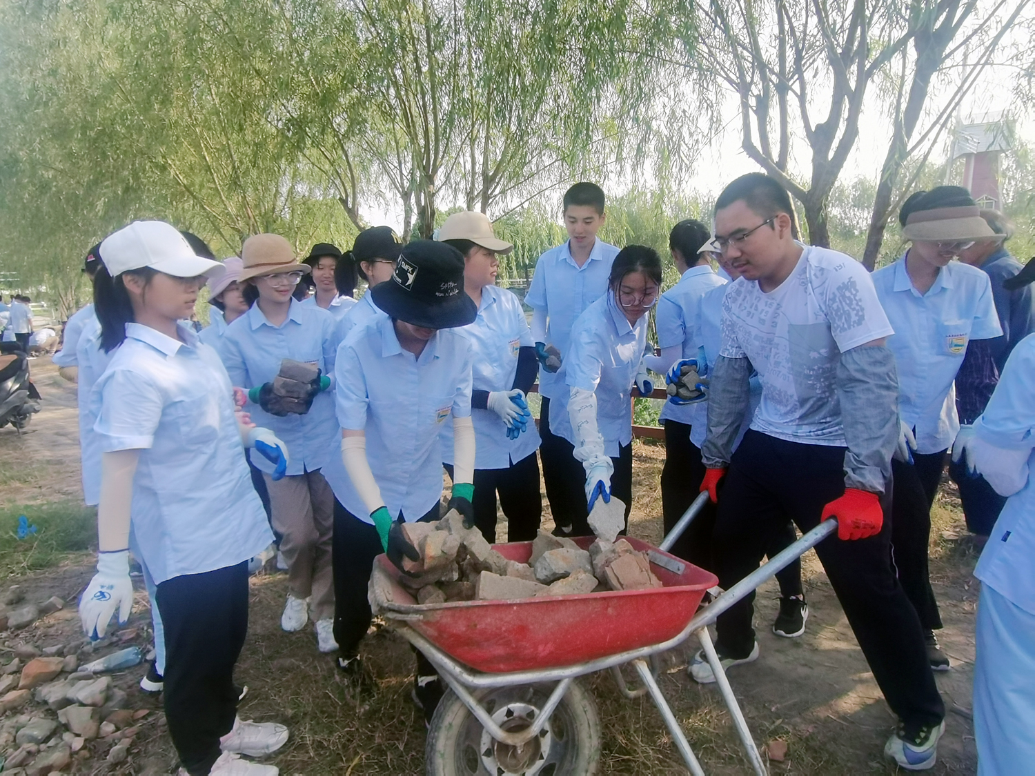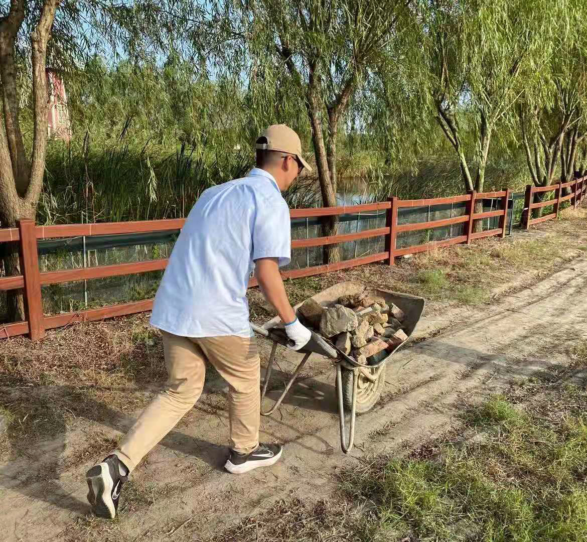宽阔的草坪上,同学们合力推着锄草机缓缓走过。其他学生三三两两行走于其上,一弯一起之间,锄草机未能剪去的杂草被逐根拔除。