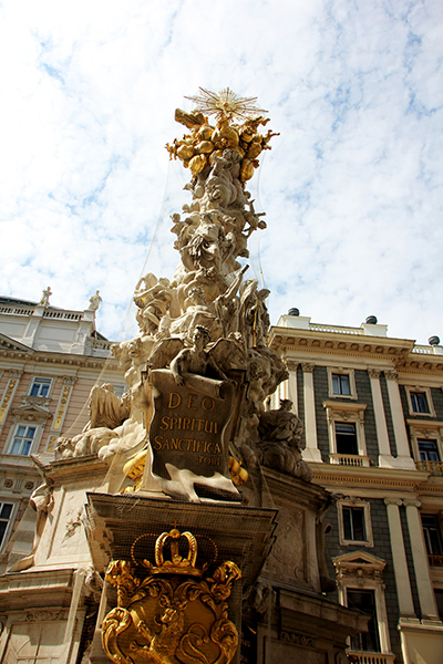 之后,团员们步入繁华的步行街。城壕中间地段竖立着一根鼠疫柱。鼠疫柱是一根金色冠顶纪念像。据说在1679年鼠疫肆虐欧洲的年代,鼠疫几乎夺走了三分之二维也纳人的生命,面对鼠疫,就连当时的奥地利皇帝利奥波特一世也束手无策。此后国王为了纪念死于鼠疫的受难者,因此下令建造了这根鼠疫柱。