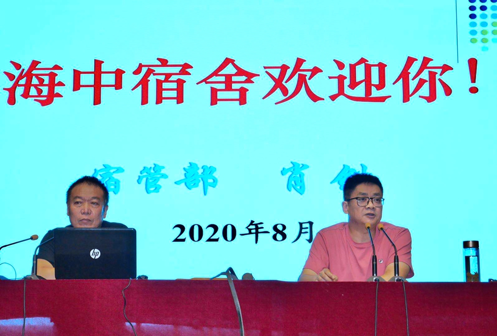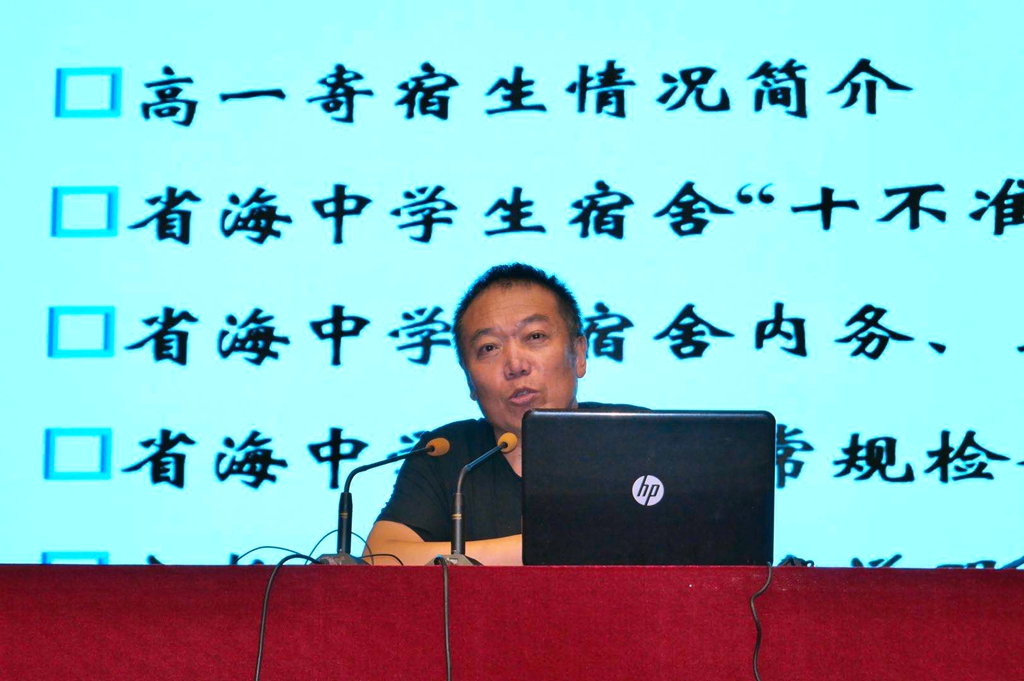 肖主任主要讲了五个方面的内容:一、宿舍情况简介;二、省海中学生宿舍“十不准”;三、省海中学生宿舍内务卫生要求;四、省海中宿舍常规检查评分细则;五、关于公物使用和报修。
