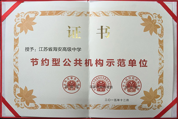 我校长期以来注重对学生节约能源和环境保护意识的教育,并身体力行,大力降低水电气等的消耗,优化学校生态建设。2013年12月我校荣获“江苏省节能示范单位”,2014年3月我校被评为“江苏省绿色学校”,学校领导对开展创建“国家节能示范单位”高度重视,各部门对节能环保工作常抓不懈,在全校师生齐心协力、共同努力下,2015年12月我校顺利通过了江苏省和国家机关事务管理局等部门的联合验收,被国家机关事务管理局、国家发改委、财政部评为全国第二批“节约型公共机构示范单位”,也是本批我省唯一获此荣誉的普通高中。