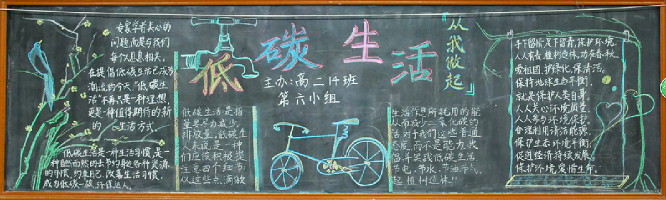 13号全国低碳日,全校教室、办公场所不开空调,全校师生一起感受高温考验,切身体验能源短缺的时光。每个班级进行以节能环保、低碳生活为主题的板报设计,学校分年级组进行评比。高一6、高二10等班级获一等奖。