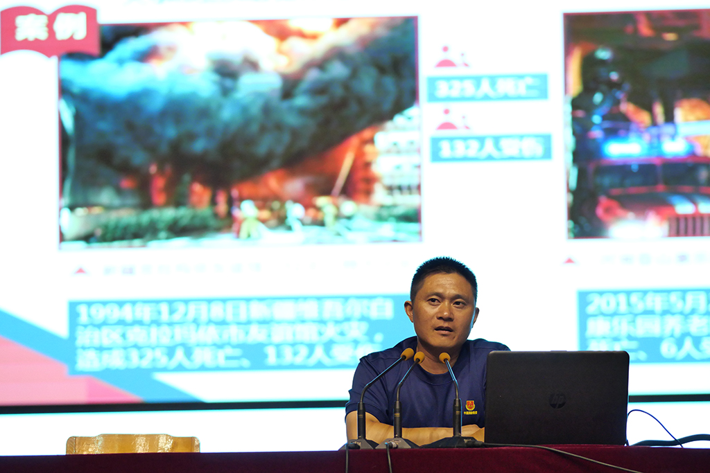 消防演练活动首先由海安市消防大队唐明春主任做相关的知识讲座。唐主任从“火灾危害与消防工作”“学校火灾及预防”“消防器、材设施及使用方法”“消防安全指示标志”“疏散逃生”“消防站及消防装备”等六个方面做了讲解。他重点强调了学校消防安全的重要性,提醒同学们要正确用电,不违章用火,注意实验室操作安全。他详细地介绍了常见的手提式灭火器、疏散逃生器械的使用方法以及疏散逃生时的9个注意事项。讲座过程中穿插视频播放,展示了火灾事故的危害性。