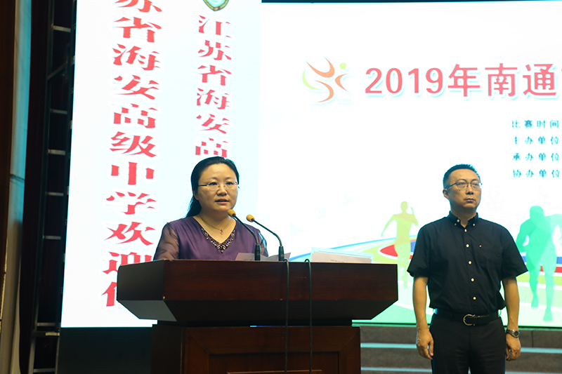 海安市教育体育局局长章晓丽在开幕式仪式上致欢迎词;南通市教育局体卫艺处处长张翊翔致开幕词,海安中学田径队史鸿杰同学代表运动员宣誓,本次大会的赛事主管助理国家级裁判徐清泉老师代表裁判员宣誓。南通市教育局副局长杨立荣先生宣布运动会开幕。