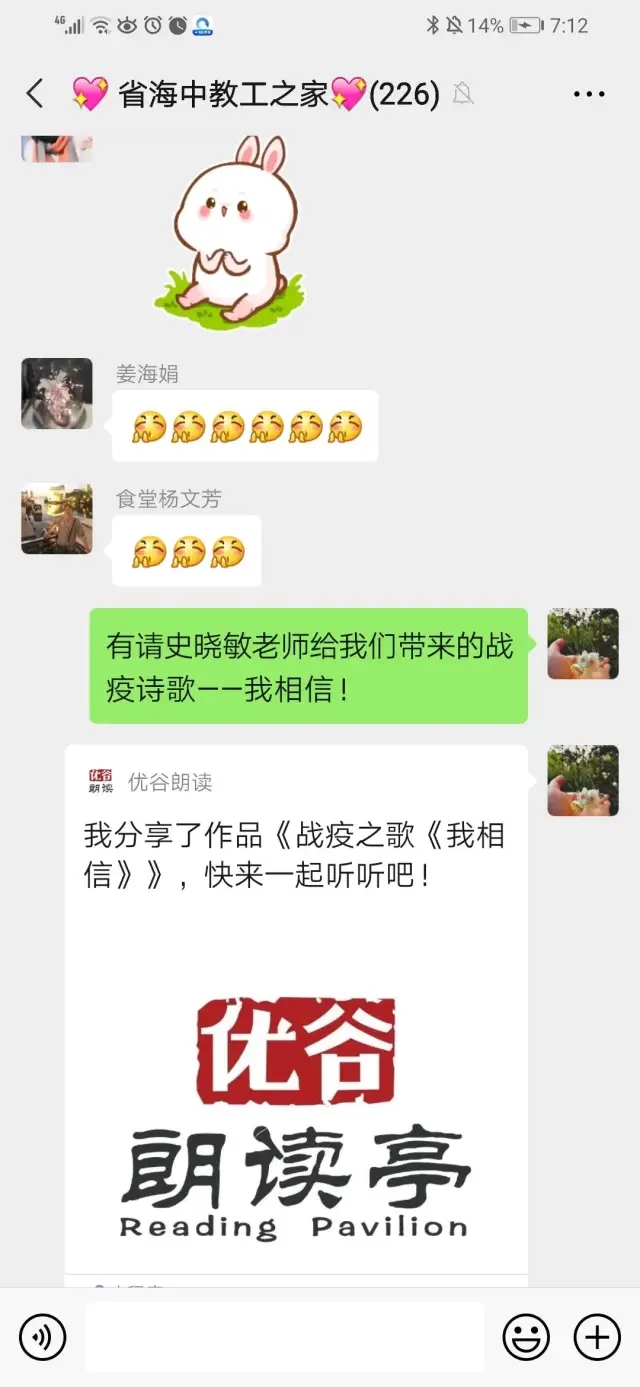 省海中线上诗词朗诵大会的成功举行,丰富了教职工的文化生活;鼓舞了教职工抗疫必胜的信心和士气,提高了教职工的审美情趣,促进了教职工不断学习,树立终身学习的理念。