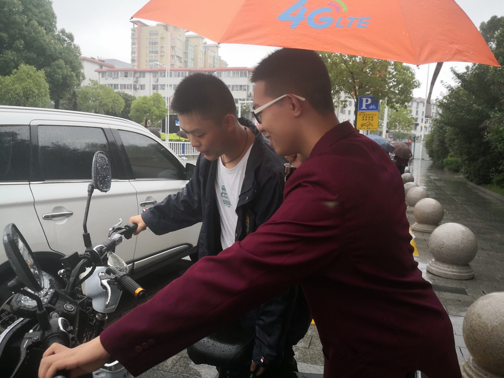 大家打着伞,两人一组,将学校大门外的自行车和教师办公楼后的自行车排放整齐。雨渐渐停止,大家就把车座、车把手擦干,让车主人用车时不至于弄湿衣服。