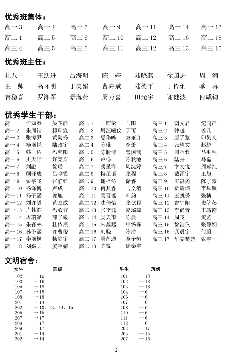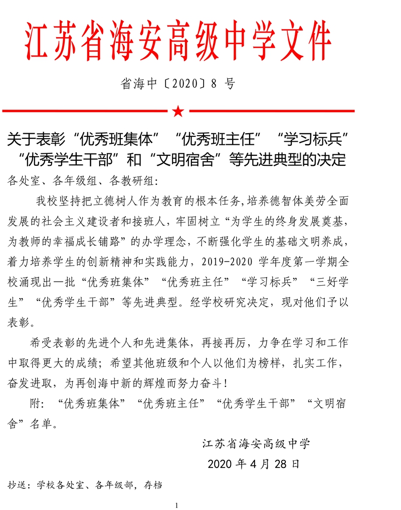 关于表彰“优秀班集体”“优秀班主任”“学习标兵”和“优秀学生干部”“文明宿舍”等先进典型的决定 来源: 发布时间:2020-04-28 00:00:00 浏览次数: 次 【字体:小 大】 分享到: 【打印正文】