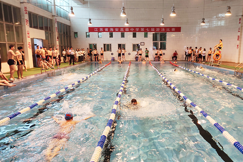 海安中学拥有全省一流的室内游泳馆和室外游泳池。来自地下一千多米的温泉水,常年温度保持在26度左右,非常适合进行游泳教学,学校将游泳作为每个学生的必修课。每个学期都要进行为期2—3周的集中教学。通过三年的游泳学习,学生们不但锻炼了身体强健了体魄,更主要的是学会了一项终身受益的生存技能。学校每年都会举办游泳锦标赛,以赛促学,以赛促练,提升学生的运动技术水平。每当寒暑假或者节假日来临,总会有大批的学生来到游泳馆,在水的世界里尽情遨游。