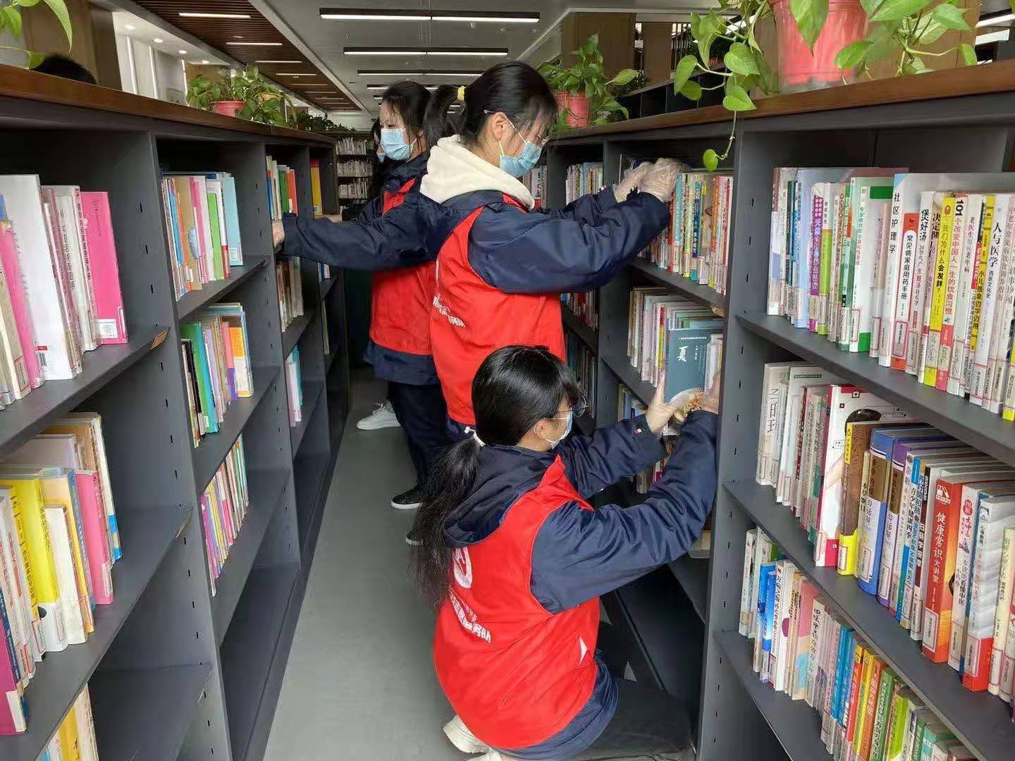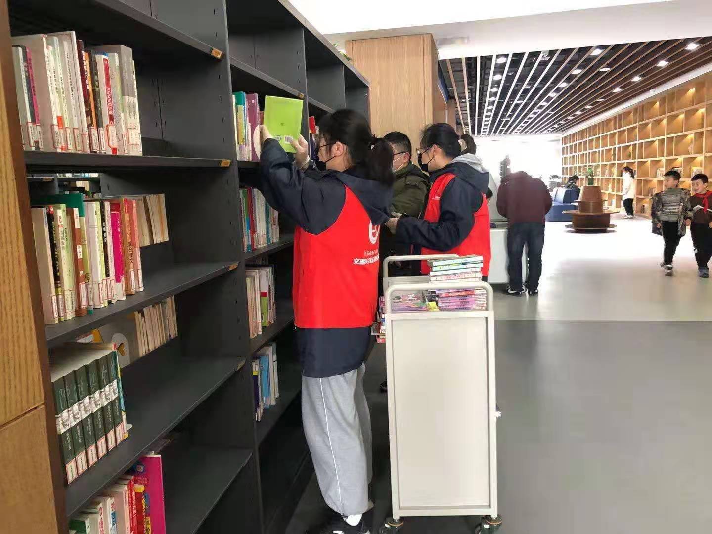 之后志愿者们分工合作,搬运图书,整理书架。大家来到各自负责的书架前,以手牌作为整书工具,将书籍摆放平齐。在静谧的图书馆里,志愿者们隐藏于层层叠叠的书架后,窸窸窣窣的只有整理书籍的声音。渐渐地,大家整理书籍的速度加快,手法也更加娴熟,只是悄然无声的服务这点不变。同学们用行动践行着“大爱无声凭谁说,一片春心付海棠”的社训。