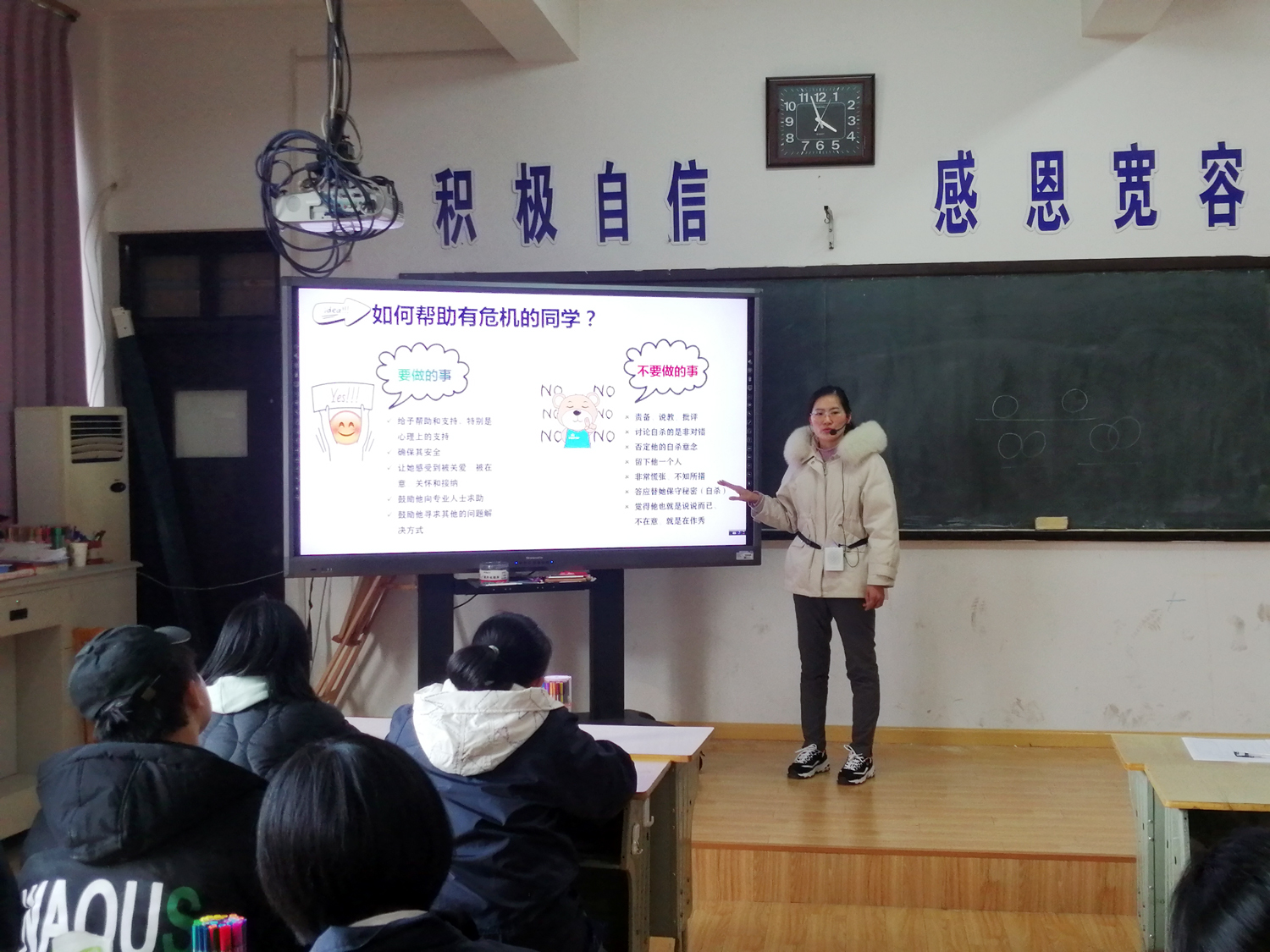 同一时间,在奥林匹克楼三楼的心理教室内,“朋辈辅导 互助成长”公益心理讲座也正在热烈的讨论中。中学生心理健康的标准、常见的心理困扰、校园心理危机的表现及特点、同辈群体之间如何互助及自助等。我校专业的心理老师为大家答疑解惑,心理社的职员们带领同学们一同活动,共同思考,以更阳光的心态面对生活和学习。
