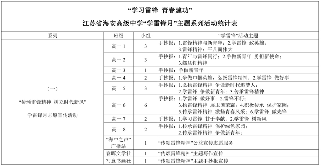 三月五日,是学雷锋日;三月,是学雷锋月。在这个月,江苏省海安高级中学发动同学们开展了学习雷锋青春建功系列主题活动。这次的活动分为三个系列:“传颂雷锋精神 树立时代新风”志愿宣传活动、“传承雷锋精神 勇为青春建功”主题社会实践活动、“传递雷锋精神 乐为他人奉献”主题志愿服务活动。最终一共有42个班级(包括社团)参与“学雷锋”活动,共派出志愿服务小组89个,参与的青年学生人数共计1006名。