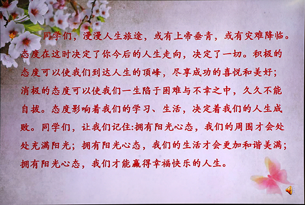 最后,班会在歌曲《我相信》中落幕。学校领导史慧敏主任和班主任张小龙老师加以点评。他们指出,态度影响着我们的学习、生活,决定着人生的成败。我们应当以乐观的态度,微笑着面对一切,相信未来可期。