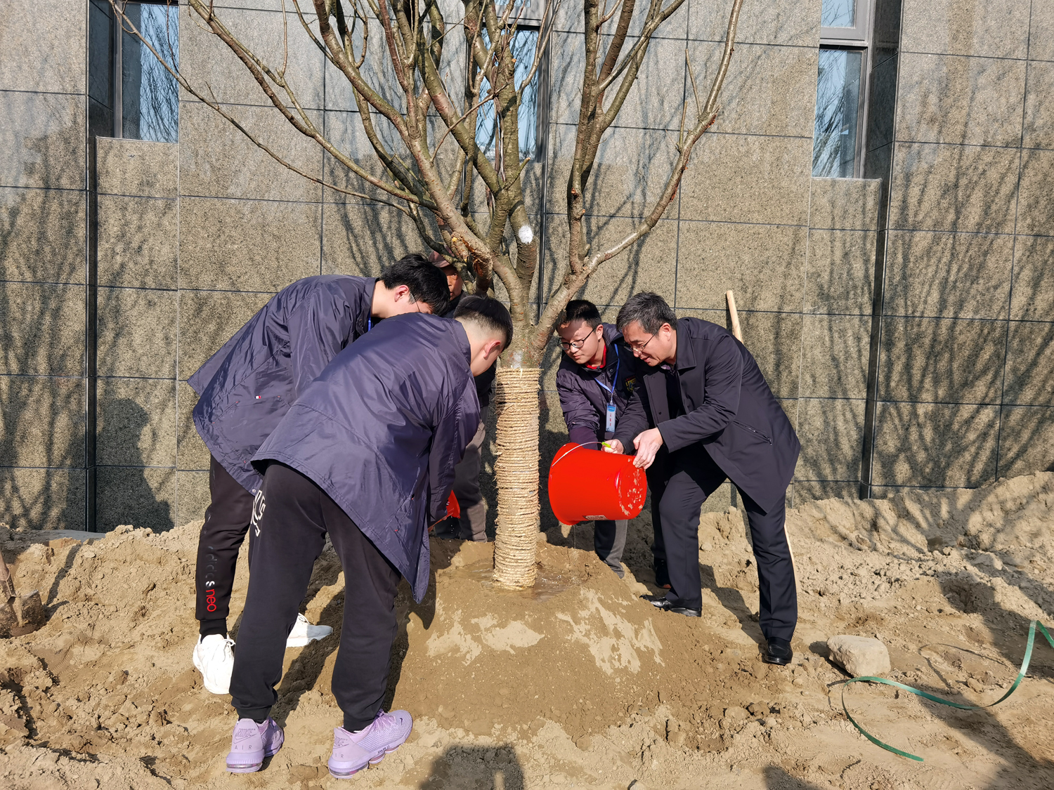 从分小组、领植树工具、找种植区到培土、浇水、剪枝,同学们欢声笑语,朝气蓬勃,奔波忙碌,跑前跑后。几位校长带领同学们一起培土、压实、浇水,动作娴熟,指导着同学们怎样下铁锹、怎样夯实土、怎样浇灌水。大家也便有模有样地跟在后面学习着。