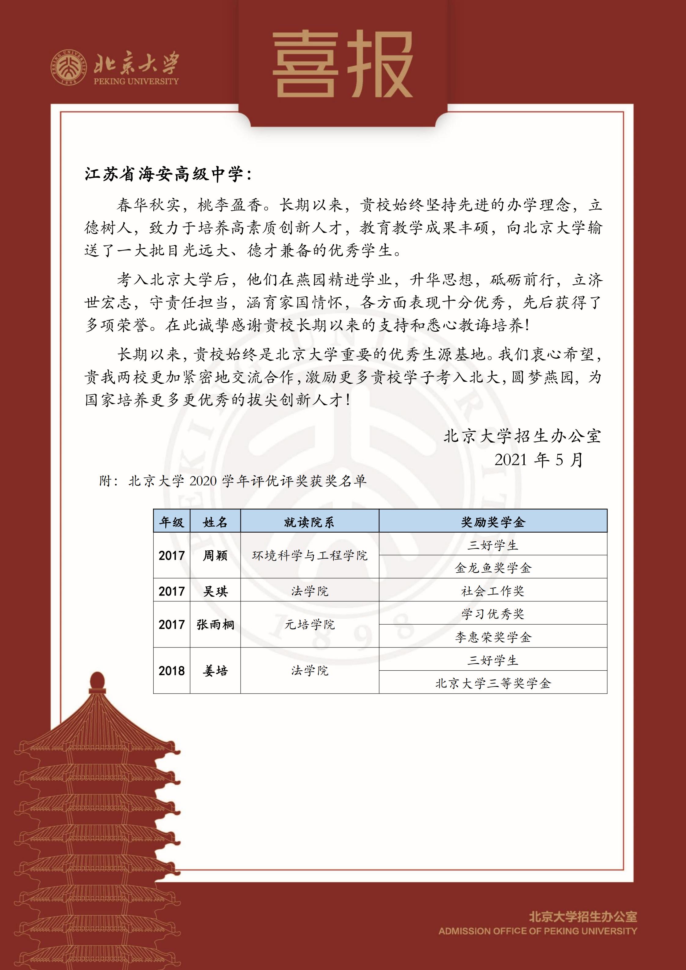 春华秋实,桃李盈香。近日,北京大学向我校发来喜报,赞誉我校作为北京大学重要的优秀生源基地,始终坚持先进的办学理念,立德树人,致力于培养高素质创新人才,教育教学成果丰硕,向北京大学输送了一大批志向远大、德才兼备的优秀学生。这些优秀学子从我校毕业后,在燕园砥砺前行,奋发进取,全面发展,取得了多项荣誉。