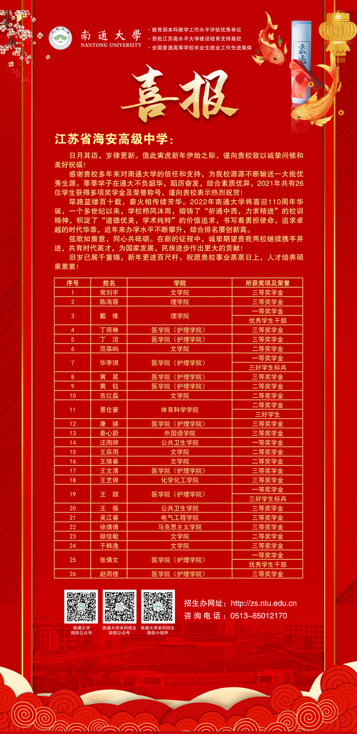 南通大学给我校发来喜报 来源:校长办公室 发布时间:2022-04-23 00:00:00 浏览次数: 次 【字体:小 大】 南通大学给我校发来喜报2021年海中校友不负韶华蹈厉奋发共有26位学子获各类奖学金及荣誉称号并感谢我校多年来对南通大学的支持期望两校携手并进共育时代英才 分享到: 【打印正文】